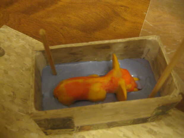Así que separó mi (ejem) molde desmoldante sobre el elefante y especialmente sobre la silicona seca de la primera mitad. Luego preparé más tanques para verter así como algunas piezas de repuesto, para usar la silicona sobrante de verter el elefante.