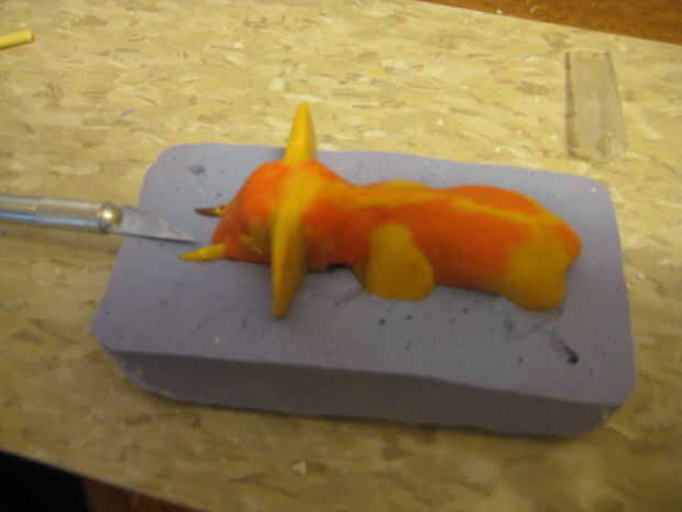 Tome un cuchillo x-acto y corte a lo largo de la línea de donde debe ser la separación. No hay ninguna manera perfecta de hacer esto, corte y conjetura. Por suerte, mía resultó ok. Recorte cualquier exceso piezas, especialmente si está bloqueando los orificios de aire o vierta los agujeros para verter del chocolate.