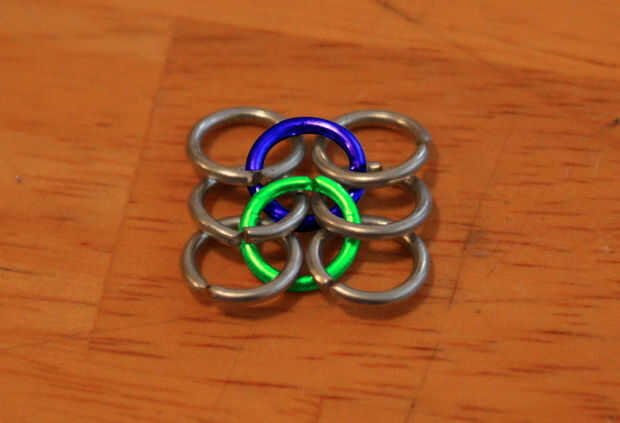 Tomar 2 anillos cerrados y conectarlos a la "mariposa" con un anillo abierto, crear otra fila. Repita este paso hasta logra la longitud deseada.