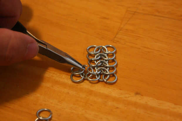 Para empezar una nueva columna para agregar anchura, tomar dos anillos cerrados en un anillo abierto e hilo de rosca del anillo abierto a través de dos anillos de la tira original, luego cerrar el anillo.