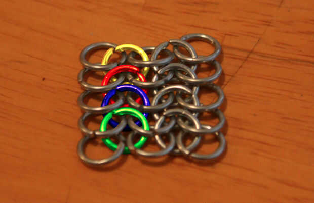 Siga tomando un anillo cerrado en un anillo abierto e hilo de rosca del anillo abierto a través de dos anillos de la tira original. el anillo abierto pasará a través de uno de los anillos que se rosca a través de cada adición anterior.