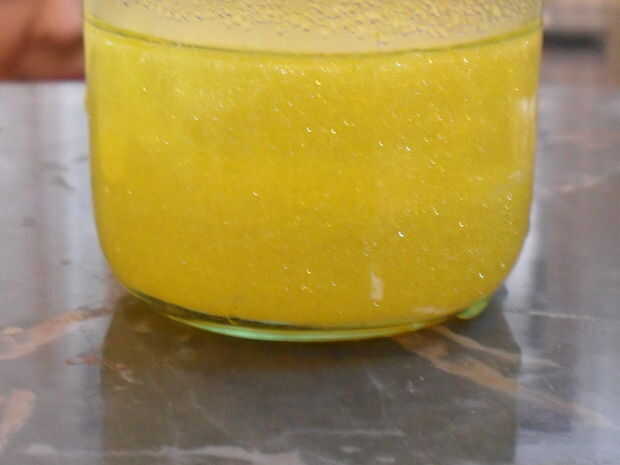 Procedimiento: mezclar en un vaso de 25 ml de solución de 0,2 M de Pb (NO3)2 y 0,25 ml de KI con concentración 0, 4 M. Observar la formación de un abundante precipitado amorfo de yoduro de plomo. Luego dejarlo decantar y añadir agua destilada en una proporción de 1:4 a la suspensión amarillo obtenida inicialmente, luego calor para disolver el precipitado. Si totalmente no disolver, agua destilada se agrega y continuar la calefacción. Por enfriamiento lento, se observa la formación de pequeñas "aletas" de oro que son realmente el yoduro de plomo. Por enfriamiento rápido, se observa un gran número de centros de cristalización que dan la apariencia de la perla amarilla. La reacción es: PB (NO3) 2 + 2Re → PbI2 + 2KNO3.