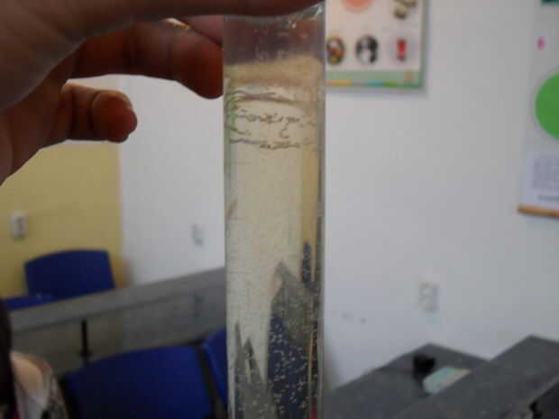 2 10% y agite de homogeneización. Me introdujo la gelatina en un cilindro graduado y esperé a fortalecer. Mientras tanto preparé 5 ml de amoníaco concentrado 5M que añadí sobre gelatina. Proceso de cristalización es muy lenta. En los primeros días hubo unos anillos blancos del precipitado formado (anillos de Liesegang). Después de dos semanas han sido en forma de cristales de hidróxido de magnesio.