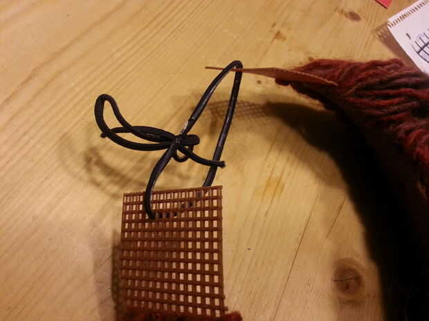 Cubrí la lona plástica expuesta con un sombrero, pero probablemente podría cortar completamente y enterrar el elástico dos filas debajo de la línea del cabello, dentro del hilo.