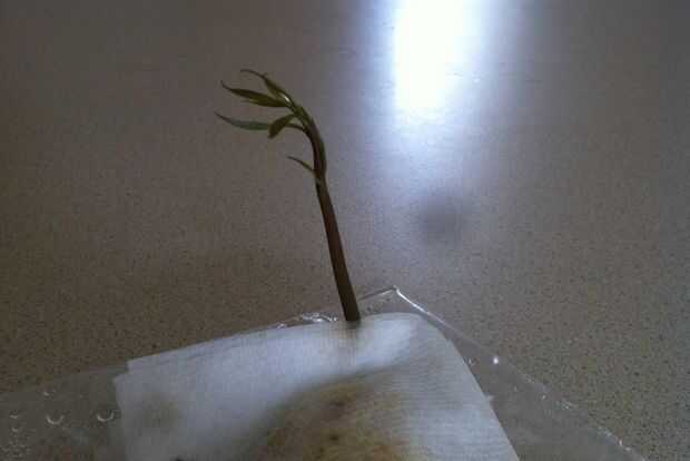 Esperar a que la semilla germinar, que puede tomar un par de semanas. Ser advertido: la toalla de papel puede parecer asquerosa. Si usted había plantado uno y la bolsa está mohosa, tírela. Si usted plantó dos y todo es mohoso, tirarlo; pero si usted plantó dos y sólo la mitad está mohosa, no tire hacia fuera. Después de ha brotado, lo saca de la bolsa y sembrar en buena tierra. Tenga cuidado de no molestar a las raíces. Asegúrese de darle pleno sol y mucha agua.