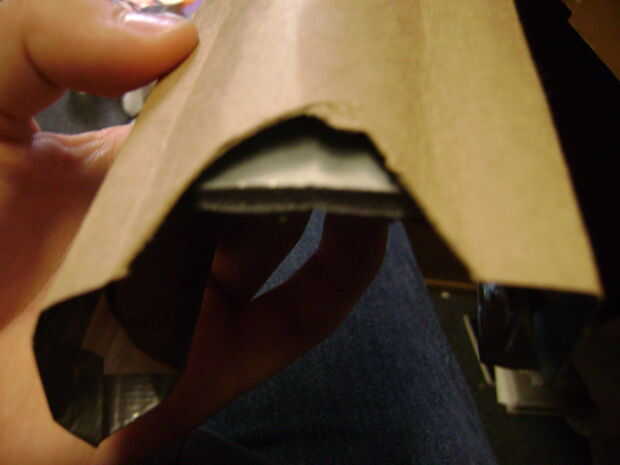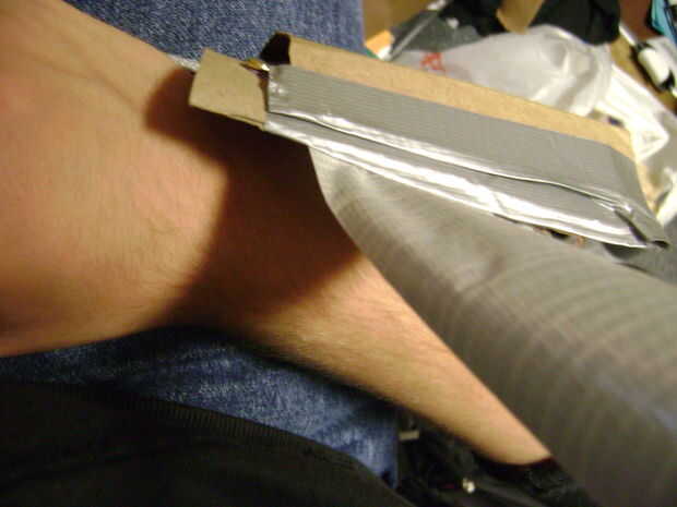 La única cosa que hacer ahora es garantizar a su brazo. Haz una tira de cinta, el lado pegajoso hacia arriba y cintas desde el interior del dispositivo sobre el brazo al otro lado. Coloque otro pedazo de cinta en la parte superior para evitar que se pegue a tu brazo/ropa.
