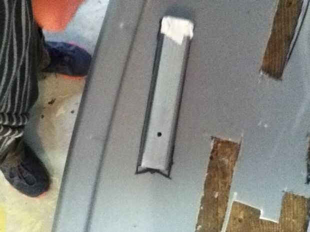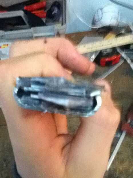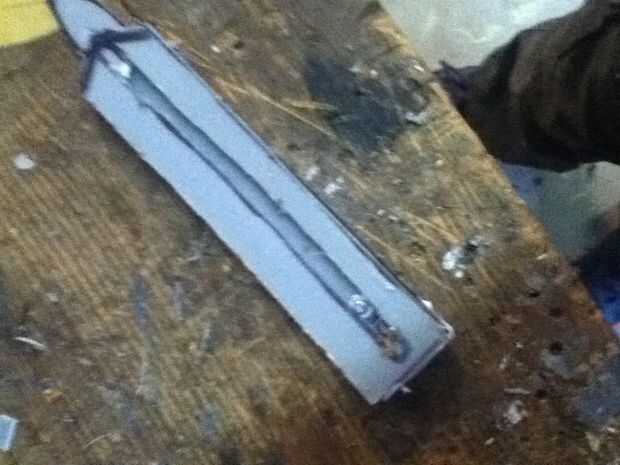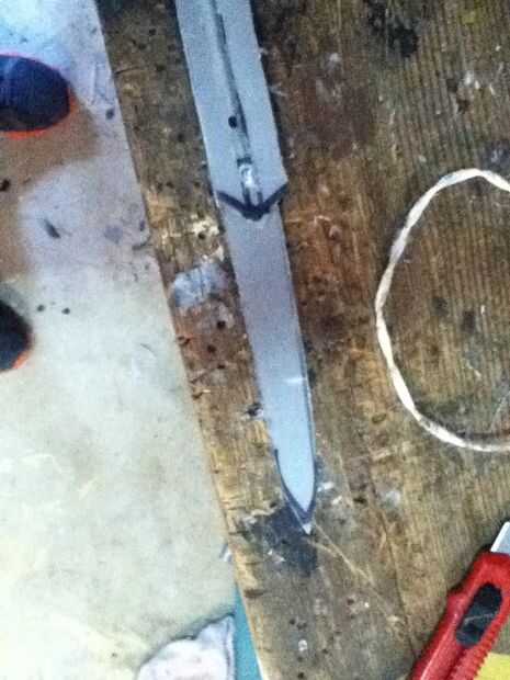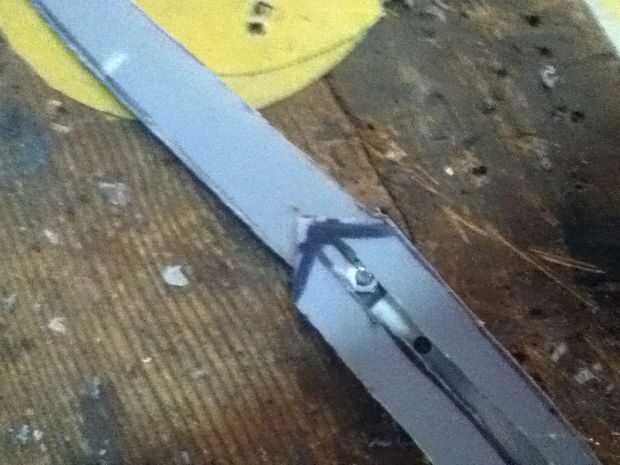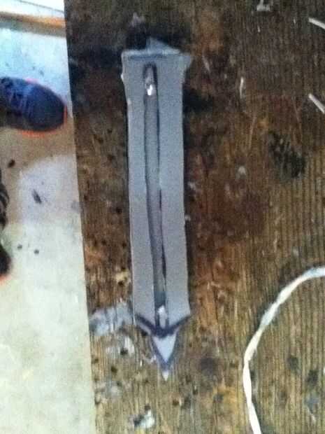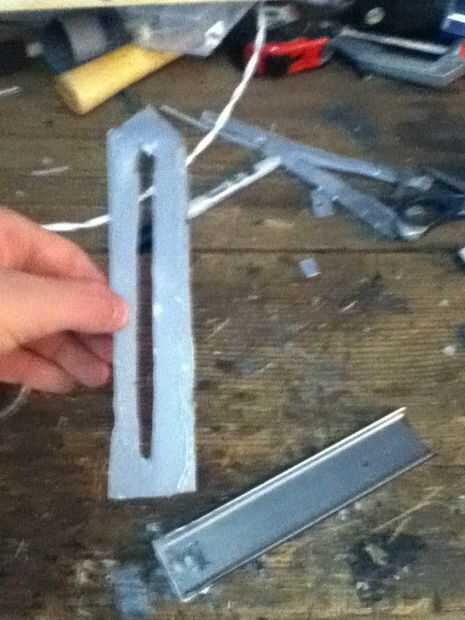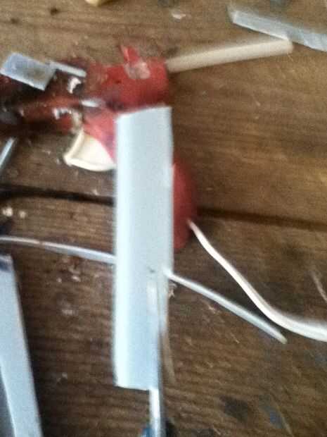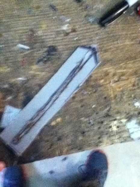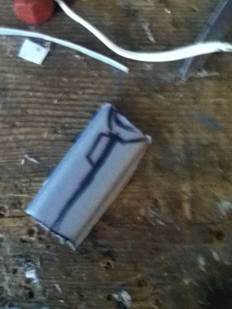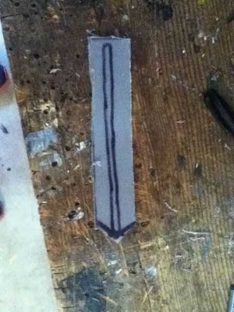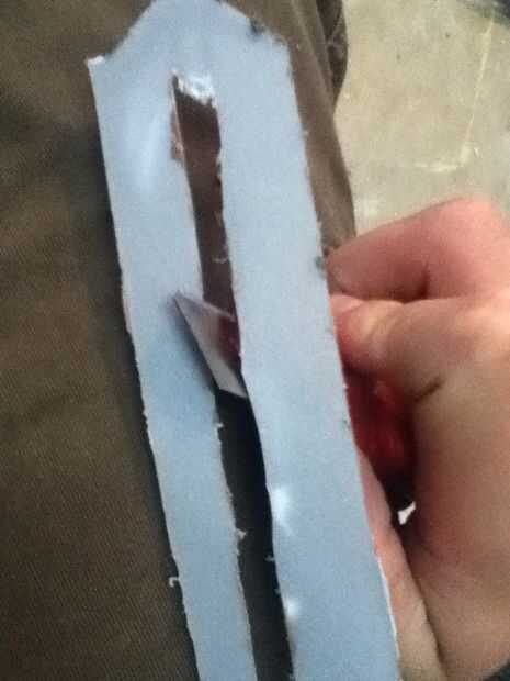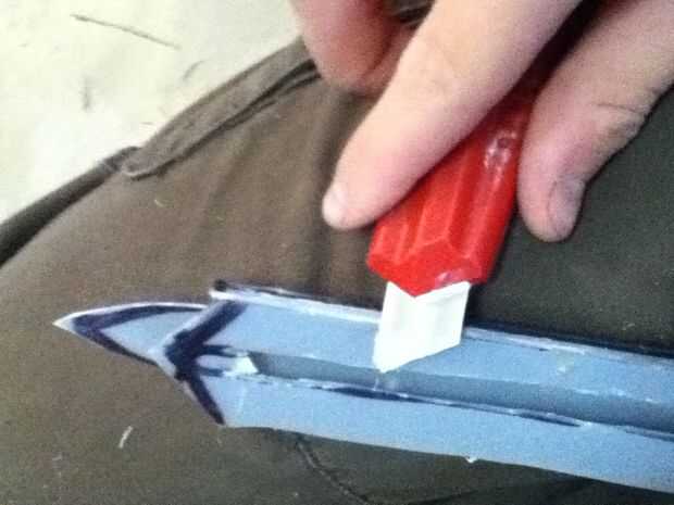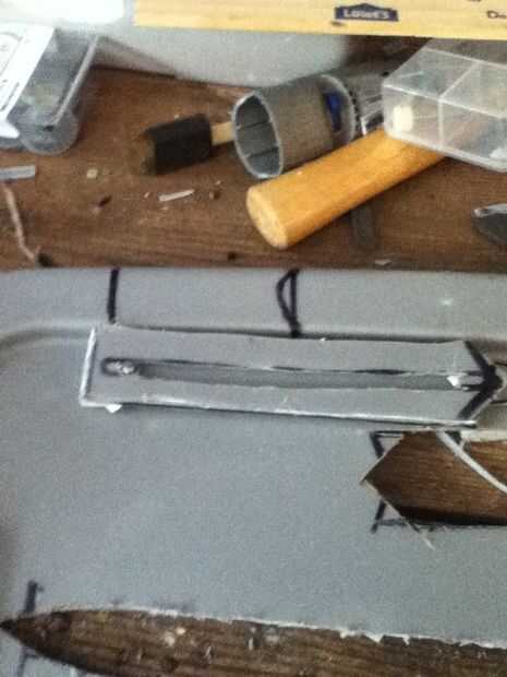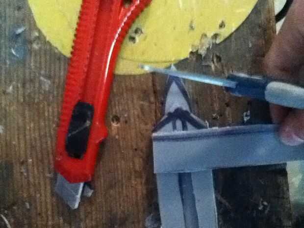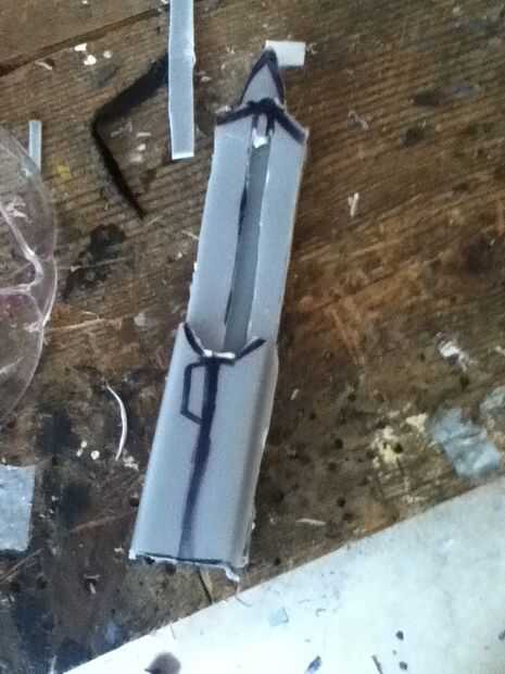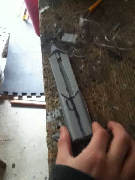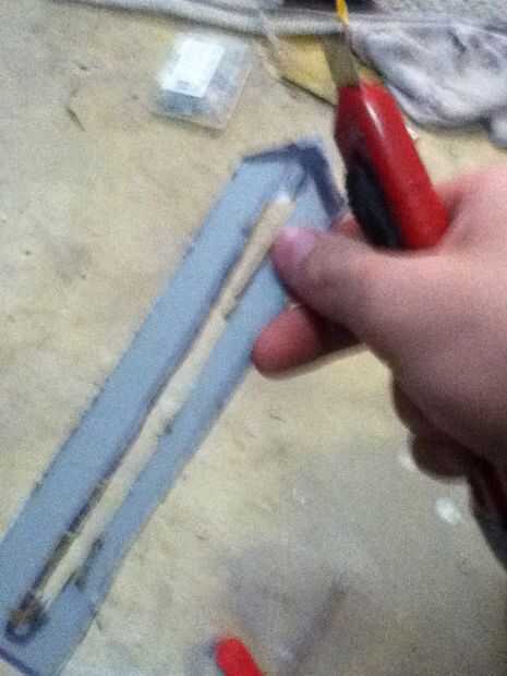 Now what you have to do it make the cover witch really makes the hidden blade. Asegúrese de hacer un punto en el extremo delantero de la cubierta. En mal estado y que punto ir al revés. Que cortarlo hacia fuera. Ya que te aviso que hay que algún plástico fresas los puede fácilmente quites con un par de tijeras. Después de usted necesitará hacer una línea casi todo el camino hasta la cubierta superior que acaba de hacer. Que poco a poco corte que recuerda no cortar hasta el final. Después de hacer puede que necesite utilizar el cuchillo del exacto para eliminar al exe. Por qué usted está haciendo este bosquete es para que el perno que está en la hoja se deslice hacia arriba y hacia abajo fácilmente. Si cuando se corta hacia fuera el perno no desliza lisamente utilice el cuchillo del exacto para hacerla más amplia. Que una vez que su feliz con la suavidad del pegamento la cubierta sobre el riel. Que recorte los lados con el cuchillo del exacto. Ahora usted puede notar que cuando usted tira de la hoja pueden menear. Aquí cómo arreglar eso. Tomar trozos de plástico y corte forma y cola les en el carril y cubierta y lados seguir haciendo hasta que estés contento con el resultado. El siguiente es la tapa que tiene el cráneo. Lo hice es en la tapa del compartimiento el filo exterior. Acabo de cortar parte de eso y ajustado hacia abajo A medida que marcan los diseños y pegado en la.