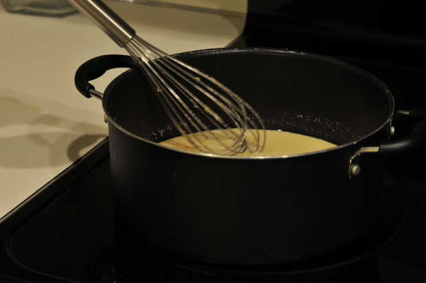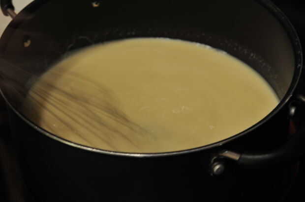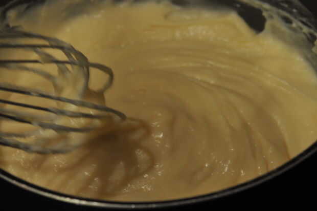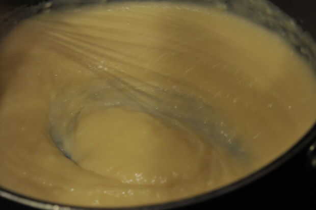 Coloque la bandeja en agitación y temperatura baja continuamente hasta que la crema comienza a espesar, pegarse a los lados de la cacerola.