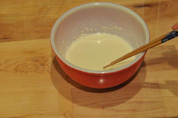 Añadir la leche y los huevos a un tazón grande de ingredientes secos. Mezclar los ingredientes hasta que la mezcla alcance una constancia suave, líquida.