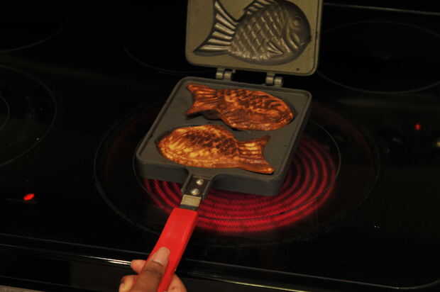 Tapa la cacerola y cocine por otros 30 segundos. Mantenga repitiendo este paso hasta que el taiyaki ha cocinado para 3 a 4 minutos en total. Levante suavemente la bandeja de taiyaki y ojeada para ver si el pescado ha convertido un agradable color dorado crujiente en cada lado. El taiyaki debe deslizarse fuera del molde cuando está completamente cocido. Si el taiyaki es pegarse a la sartén o si aún no ha dado un color dorado el taiyaki necesite tiempo de cocción adicional.