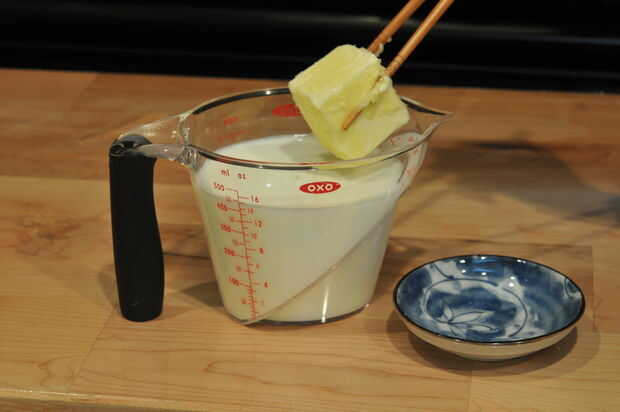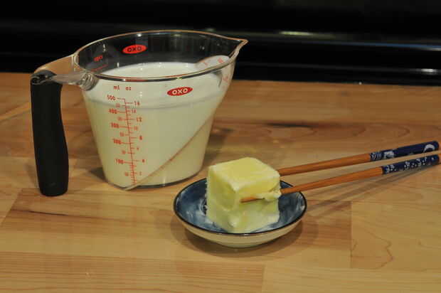 Añadir 4 cucharadas de mantequilla sin sal a la 1 3/4 taza de leche.