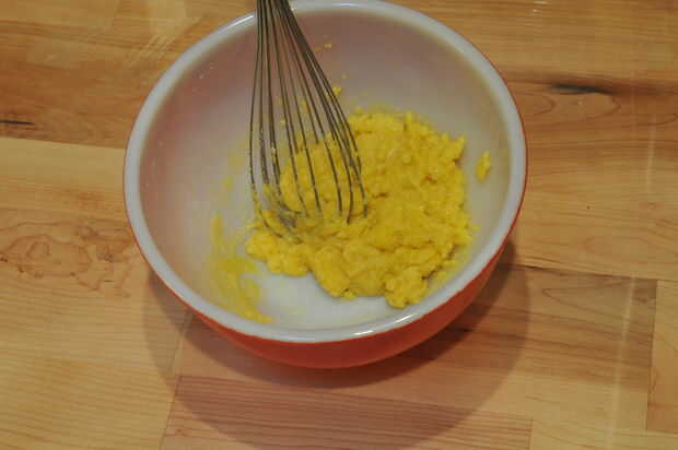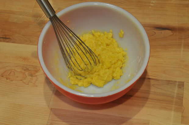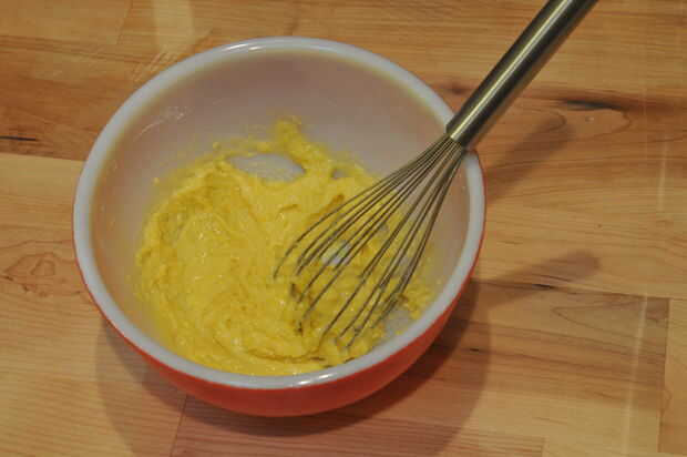 Utilice un batidor de alambre para mezclar todos los ingredientes en un tazón grande. La mezcla debe terminar con una suave y homogénea, textura de pasta. Si se ve como huevos revueltos o tiene demasiados grumos significa que necesita seguir mezclando los ingredientes un poco más.