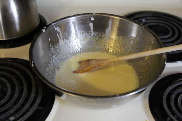 Nota: Este es el paso más crítico y difícil del proceso de fabricación de crème brûlée. Sumar la crema y los huevos se realiza en un proceso conocido como 'Temple'. Este proceso nos permite añadir crema caliente a los huevos frescos sin resultar en huevos revueltos cremosos. Se añade más crema, puede añadir más rápidamente, pero siempre pecar de cauteloso. Un asistente puede ser útil para ayudar a agregar la crema mientras revuelve. Si desea una discusión más detallada de templar, consulte la sección solución de problemas.