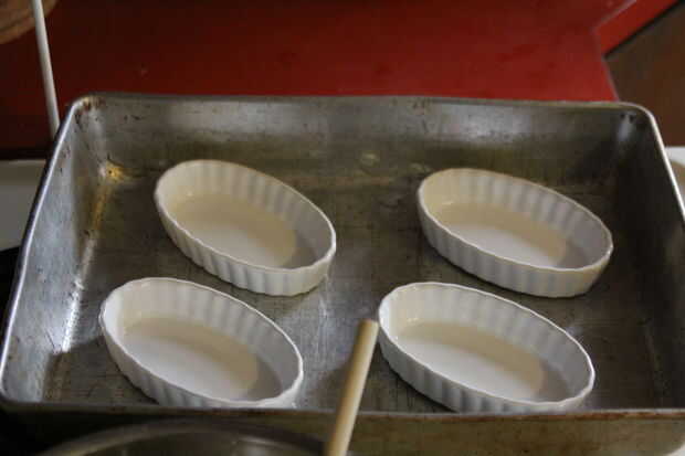 Con cuidado verter agua hirviendo en la sartén, asegurándose de que no se derrame agua en los recipientes individuales. Llene la sartén hasta que el nivel del agua es la mitad de la altura de los moldes. (El enlace de Youtube a continuación muestra este proceso con más detalle).