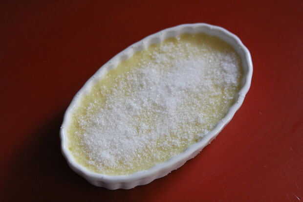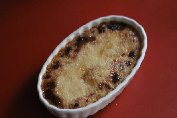 i. la antorcha: mueva la flama hacia adelante y hacia atrás sobre el crème brûlée con liso, barriendo los movimientos hasta que el azúcar se convierte en un color marrón oscuro.