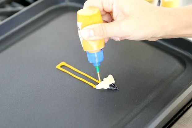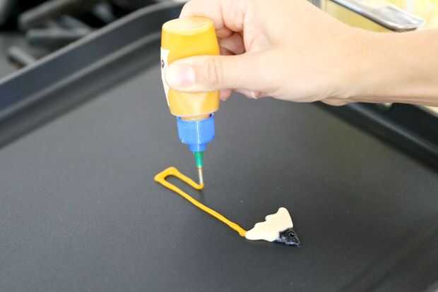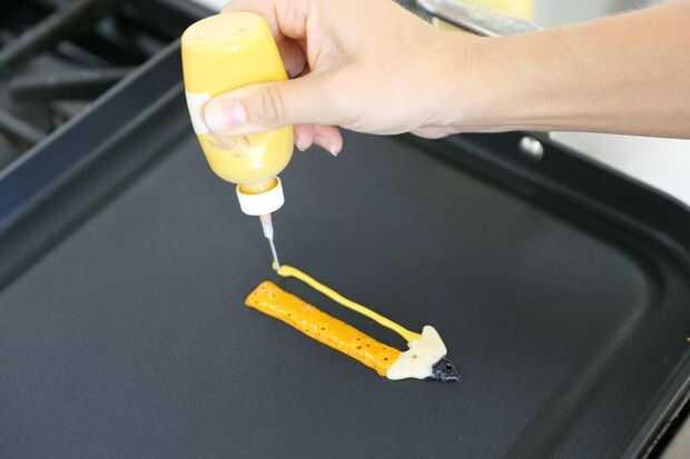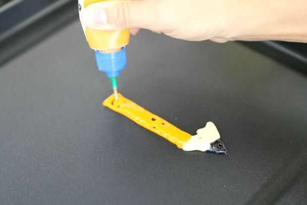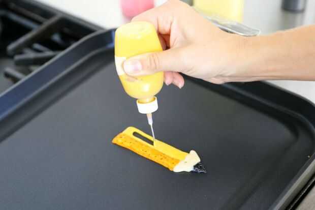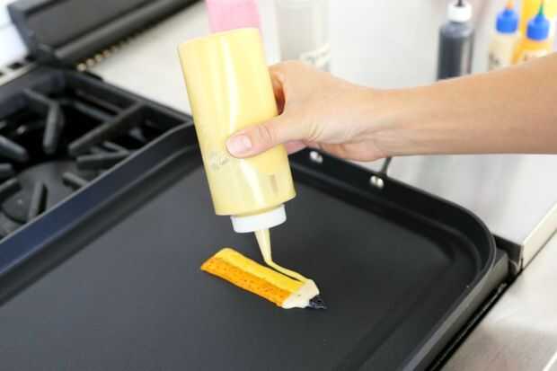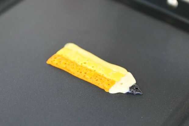 Repetir este proceso con la naranja y luego amarillo, trabajando su camino a la derecha. IMPORTANTE: Asegúrese de que todos los colores apuntan entre sí para que la crepe acabada sea un panqueque sólido en lugar de un montón de pequeñas formas individuales. Las líneas amarillas finales deben alinearse con la anchura de la punta del lápiz.
