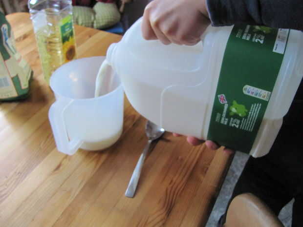 Añadir la harina y la leche en este paso. Usted tendrá que poner el 10-12 cucharadas de harina y 500 ml de leche.
