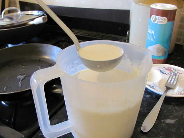 Paso 1: reunir los ingredientes para la masa. For the batter:1 taza de harina refinada2 cucharaditas de azúcar1/4 taza de harina de arrozuna pizca de semillas de mostaza1/2 a 2 tazas de lecheAceite, para cocinar esto.Paso 2: reunir los ingredientes p