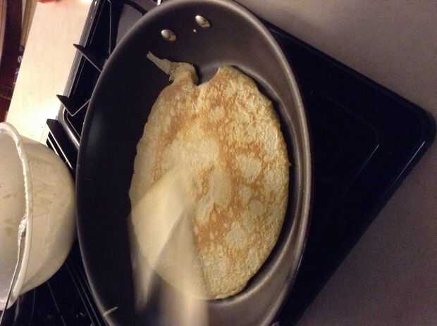 Cuando usted piensa que su crepe está listo para girar, voltear lentamente con su espátula. Pero seguro meterse debajo de la crepe y girar lentamente.