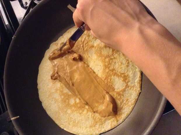 A continuación, inmediatamente que desea agregar la mantequilla de maní o Nutella si desea y su fruta en rodajas. En este caso estoy usando crema de cacahuate, fresas y bananos. Tan con una mantequilla cuchillo diseminan una cucharada de mantequilla de maní en el centro de la crepe y lo verticalmente arriba y abajo su crepe.