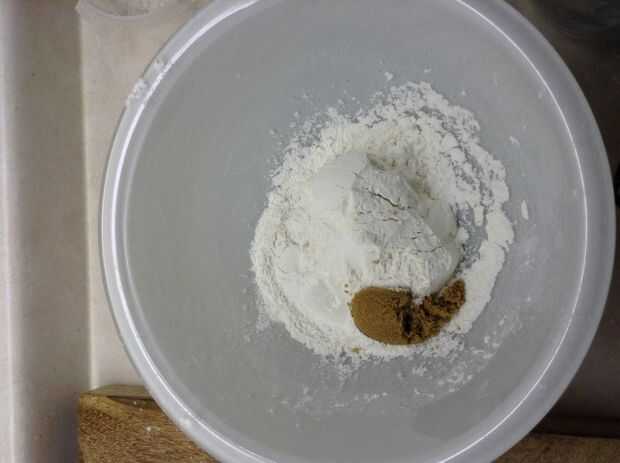 En un tazón mediano agregue 1 taza de harina multiuso, 1 cuchara de azúcar moreno y 1/4 de una cucharadita de sal. (Ingredientes secos)