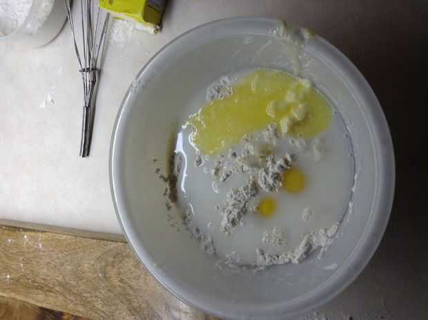 Después de eso, romper 2 huevos en el mismo recipiente que contiene los ingredientes secos. Así como añadir el resto de los ingredientes húmedos, 3/4 tazas de leche, 1/2 tazas de agua y 3 cucharadas de mantequilla salada derretida.