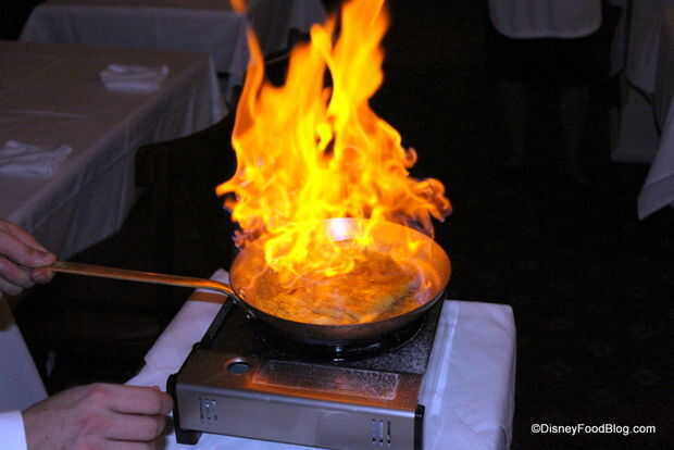 Agite el plato suavemente hacia adelante y hacia atrás mientras spooning el licor llameante sobre los crepes hasta que el fuego muere.