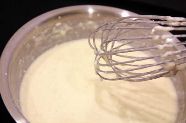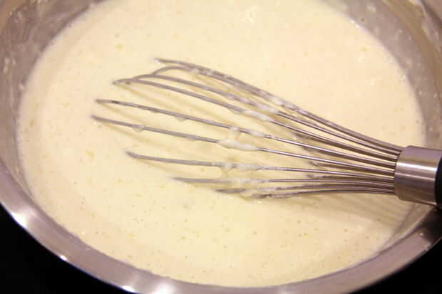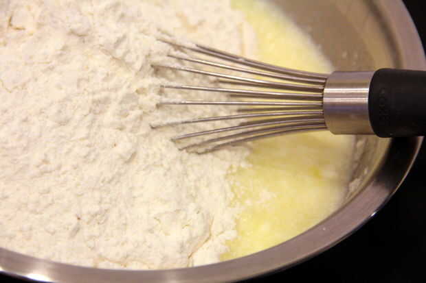 Alternativamente, batir todo junto. Eliminar todos los grumos de harina.
