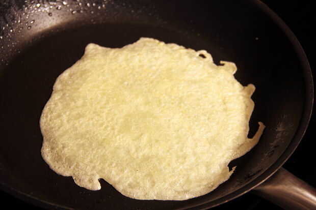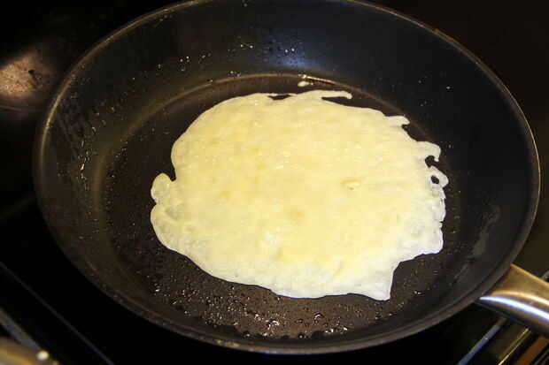 Recoger la olla de la estufa. Agitar hacia adelante y atrás para asegurarse de que la crepe no se pega a la sartén. Luego, en un movimiento rápido, levante la bandeja y adelante. Coger la volteada la crepe en la sartén.
