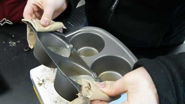 Usar guantes (y si es posible pinzas), cuidadosamente recoger el contenedor de bismuto líquido y rápidamente viértalo en la Copa del otro y apartar la taza caliente. (intentar verter el bismuto sin verter la capa gris en la parte superior, contiene impurezas que pueden inhibir los cristales).