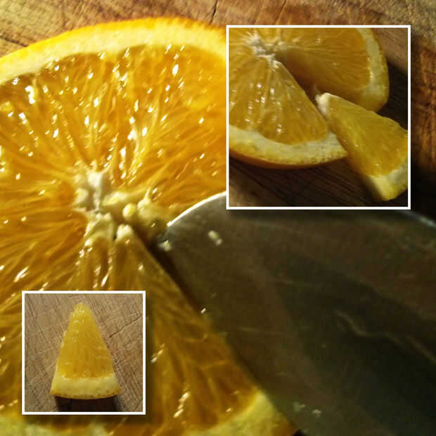 Cortar una naranja por la mitad para que puedas obtener una rebanada redonda agradable. Cortar dos rodajas de naranja. Si usted realmente escogió la más bonita en la pila sus rodajas de naranja deben tener una estrella en el centro. Utilice esto como su guía y fuera una simple cuña de naranja.