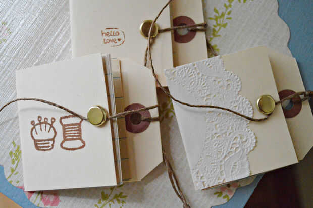 Decorar la parte delantera por sellado, colocar papel bonito, fotos o lo que desea! Doble a la mitad su pequeña libreta y gire la cuerda alrededor del brad.