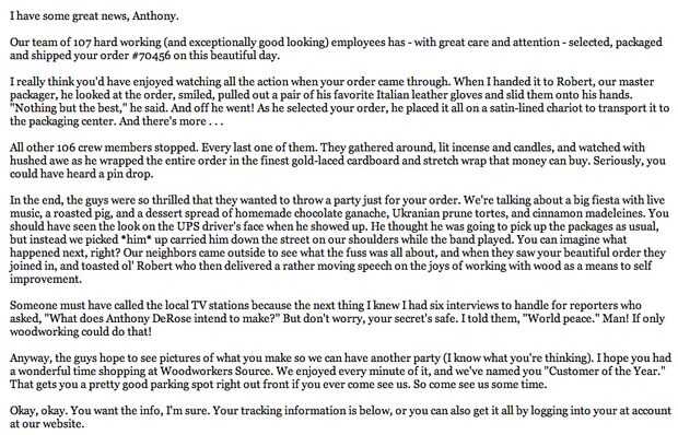 Después bosquejado encima de mis diseños, ordené la madera en línea en woodworkerssource.com (tienen una gran selección). Prefiero escoger mi propia madera, pero Im en la Universidad así que ordenar en línea era más conveniente. Este sitio no sólo tiene emails de confirmación muy ingeniosa (véase foto), pero también tiene 2 x 2 giro stock a un precio bastante bueno, tengo 30" pedazo de madera de nogal por $15, y logró que todos tres cucharas de ella.