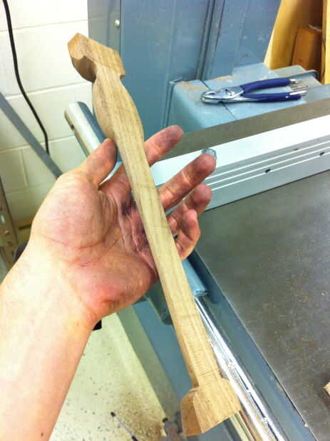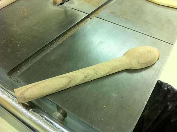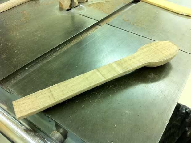 Para obtener dos cucharas de 13" pedazo que torneada en primer lugar, banda-había aserrado todo por la mitad, me da dos formas de aspecto spoon-ish. Típicamente, un eje con una bombilla redonda en un extremo es difícil de cortar con una sierra de banda (si quieres un corte recto, es decir). Sin embargo, las piezas de 1,5 pulgadas en los extremos todavía tenían lados planos que fueron alineados con los demás, darme una superficie agradable a descansar contra la mesa de la sierra y la guía.