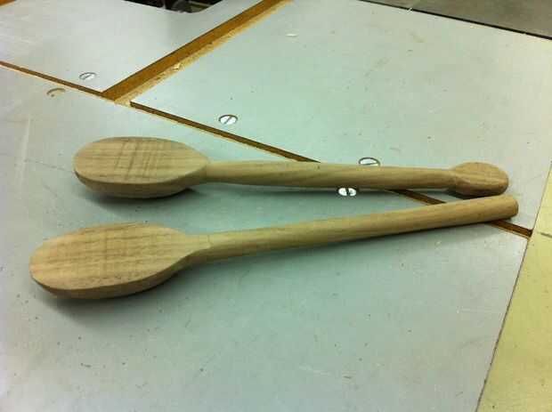Para las cucharas de 10", con la lijadora de banda tomé material de las manijas semicirculares que eran más o menos circulares otra vez y limpiar un poco las dimensiones 'bowl'. En una cuchara traté una bombilla esférica en el extremo de la manija como una característica interesante de la forma. Terminó buscando mas como otro plato de cuchara, pero más pequeño. Ah bueno, aprendemos de nuestros errores! También puse un poco de variación del espesor del natural en el mango de esta cuchara. En la otra cuchara sólo formé un mango normal, recto, cilíndrico.