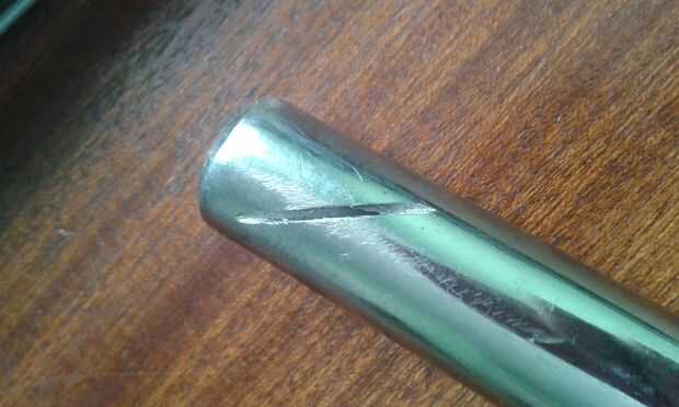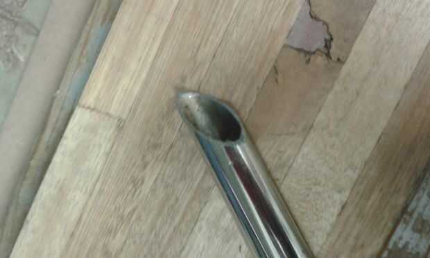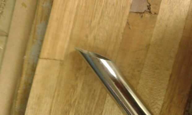 Una vez que ha hecho que el lápiz al otro extremo de la tubería (no uno donde marcaste el mango.) Trazar una línea desde el borde de la hoja en la parte superior hacia abajo y a para hacer una línea inclinada (mirar las fotos para obtener ayuda). Corte a lo largo de la línea inclinada que ha hecho, con la sierra, ya que esto creará la punta de la hoja.