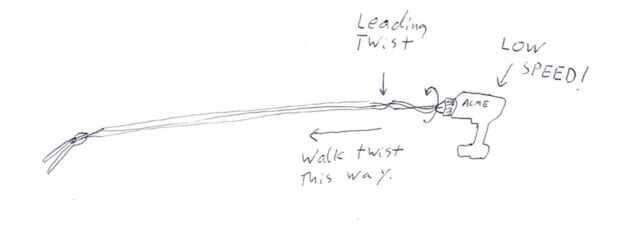 Podrá ver el giro empieza a principio de la forma en el taladro. Continuar a utilizar los dedos como guía, camina lentamente hacia el otro extremo del alambre, manteniendo por delante de la torcedura. Si usted necesita detener el giro para desenredar algo, dígale a su ayudante para detener. Otra vez, usted va para un suave giro inicial.