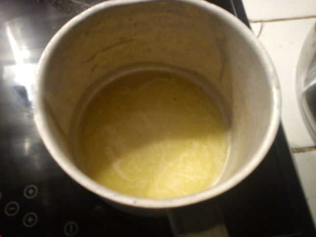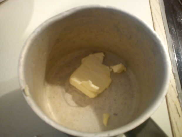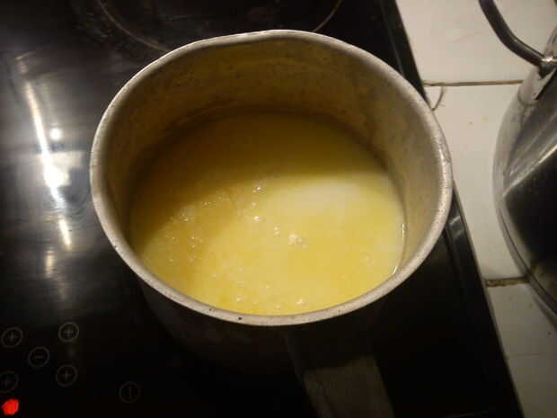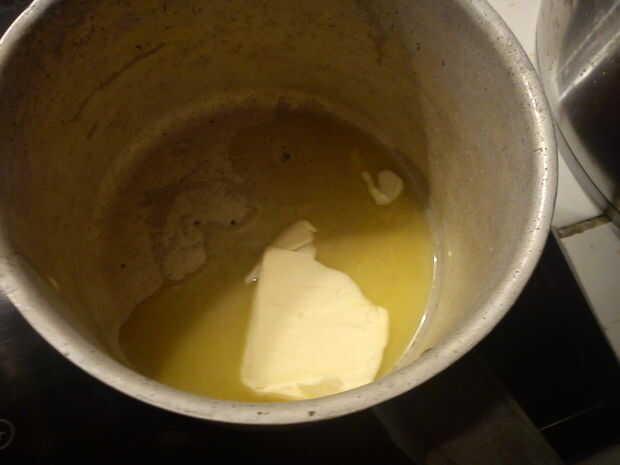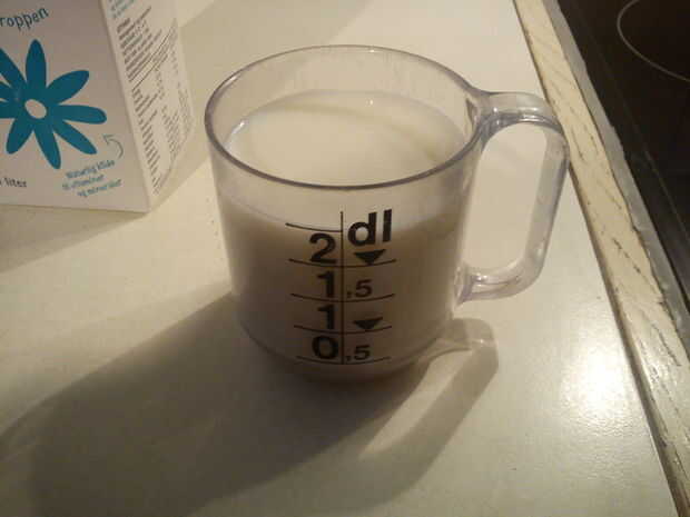 Derretir 1 cda de mantequilla en una olla y agregue la leche cuando se derrita. Calentar la leche a dedo-temp. (37 ° C) si se utiliza levadura fresca, usted debería agregarlo en este paso después de haber calentado la leche. No, agregar la levadura si la leche está más caliente y 37C. En lugar de utilizar agua o leche, usé 4 dl de leche y 2 dl de agua.