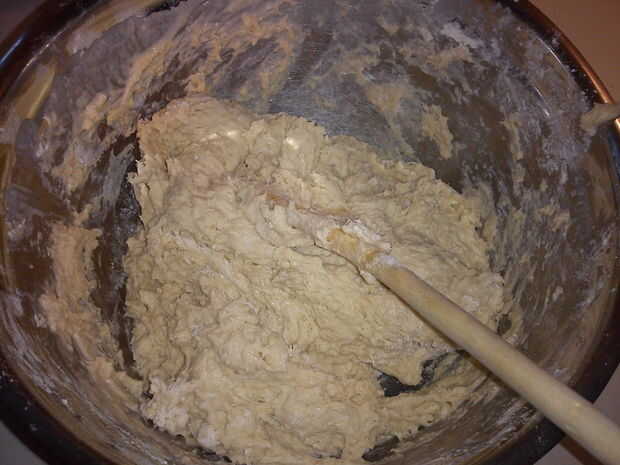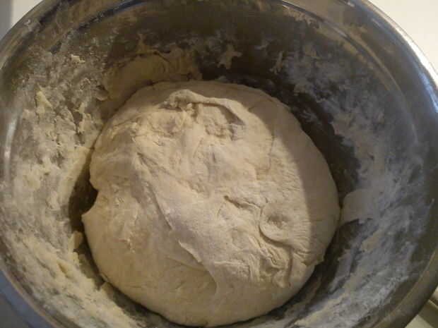 Mezcle la levadura y la sal en la harina mide antes. Añadir la leche caliente y mantequilla a los ingredientes secos y mezclar bien. Amasen la pasta hasta que esté suave y no se pega a las manos o el tazón de fuente.