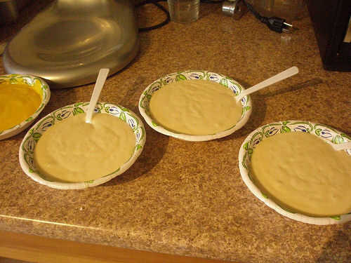 Mezcla separada en recipientes más pequeños, uno para cada color que desea en sus tortas de la taza. Tuve 5 tazones de fuente más pequeño para el rojo, amarillo, verde, azul y púrpura.