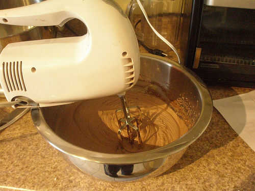 Mezclar todos los ingredientes juntos en un tazón grande. Mezcla con una batidora de mano baja por 30 segundos hasta que estén mezclados todos los ingredientes, luego mezclar a alta durante 2 minutos.
