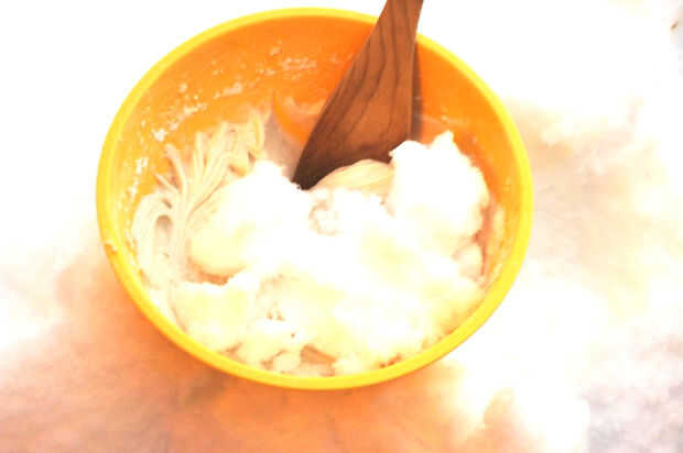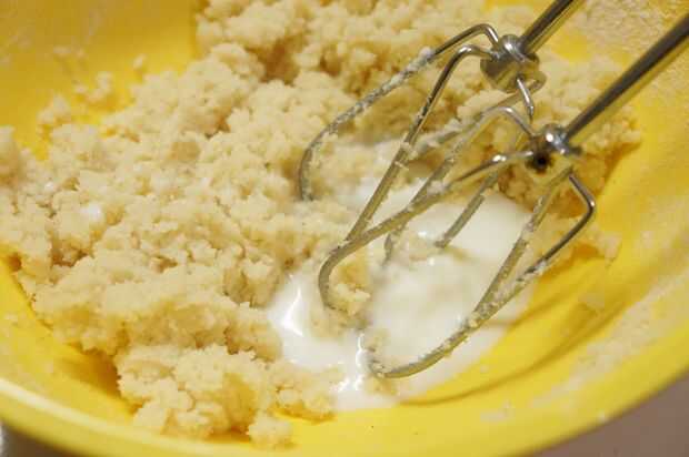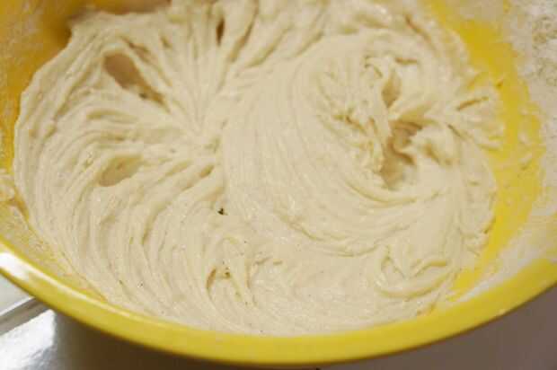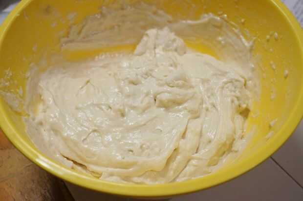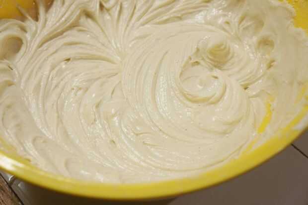 Agregue a la mezcla crema alternando con la leche, comenzando y terminando con la mezcla de harina. Mezclar después de cada adición, usando una batidora de mano. La mezcla será espesa y suave antes de añadir la nieve.