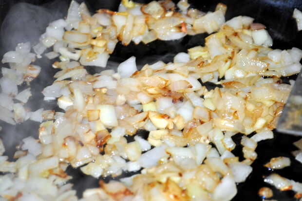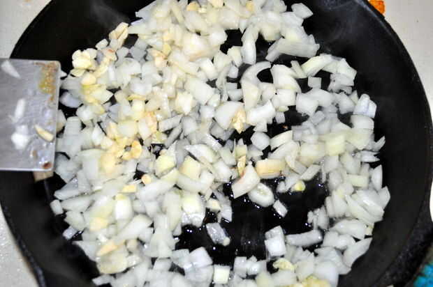 Calentar 2 cucharaditas (5 ml) de aceite de oliva en una sartén sobre fuego medio alto. Una vez que el aceite es buena y caliente volcar la cebolla y el ajo en. Cocinar la cebolla y el ajo hasta que aclarado y un poco marrón. Asegúrese de revolver con frecuencia para guardar de la quema. Puede hacer referencia a las fotos para ver la diferencia entre el crudo y la cebolla cocida.