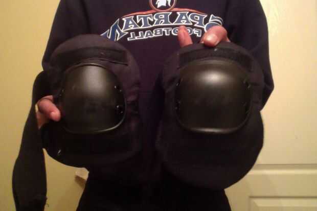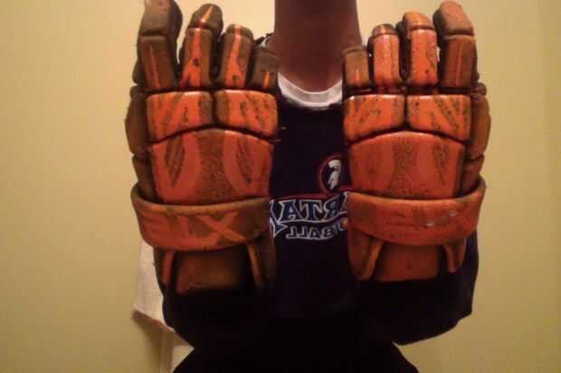 Lo utilicé para mis guantes estaban mi vieja Lacrosse STX ya aerosol pintado naranja. Entonces para mi rodilleras usé mi vieja rodilleras Skate.