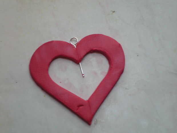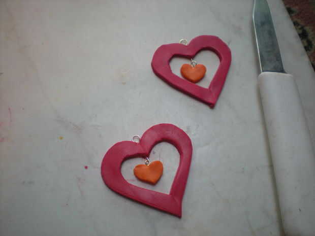 Sacar un pin de eyelit y con cuidado Inserte la arcilla. Hacerlo no clipthe pat de la parte inferior de la do de arcilla al corazón naranja. Luego coloque en bandeja y hornee según las instrucciones.