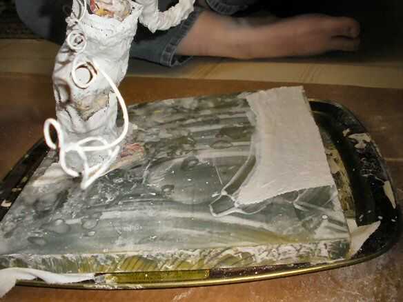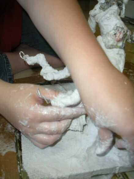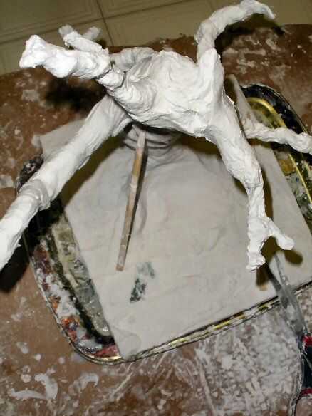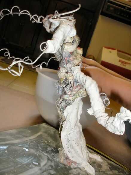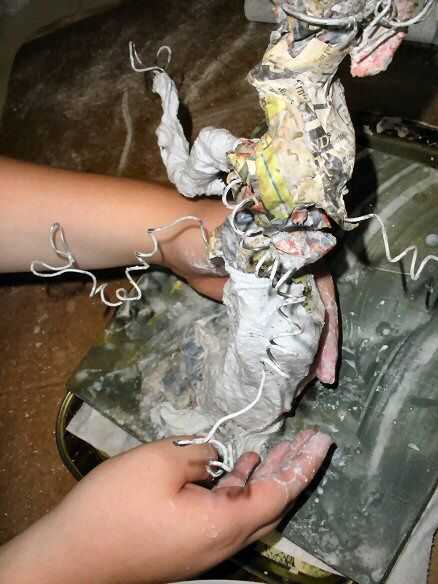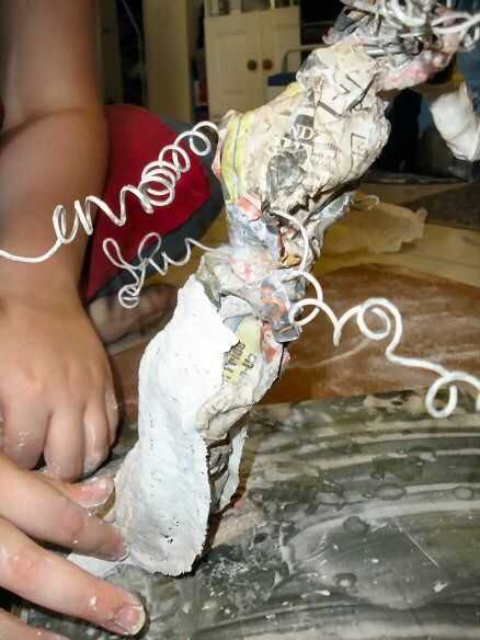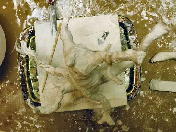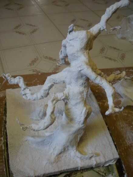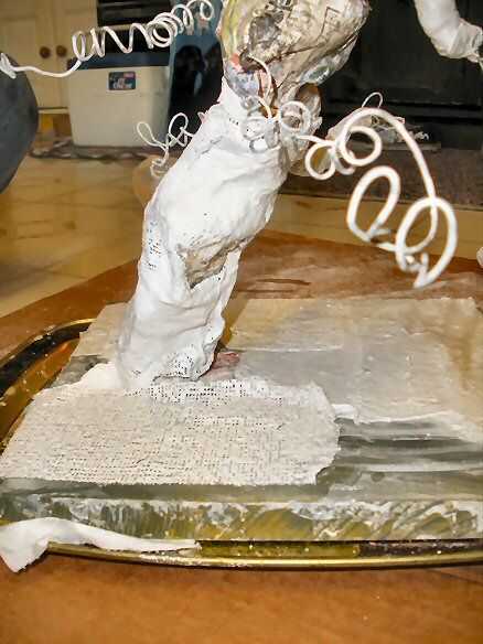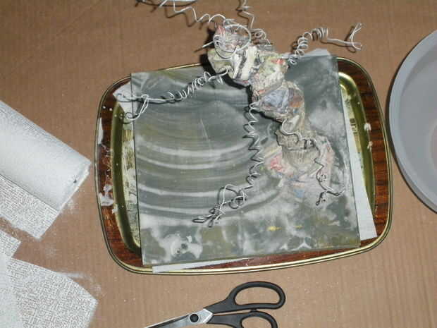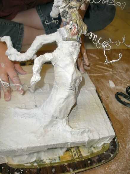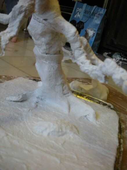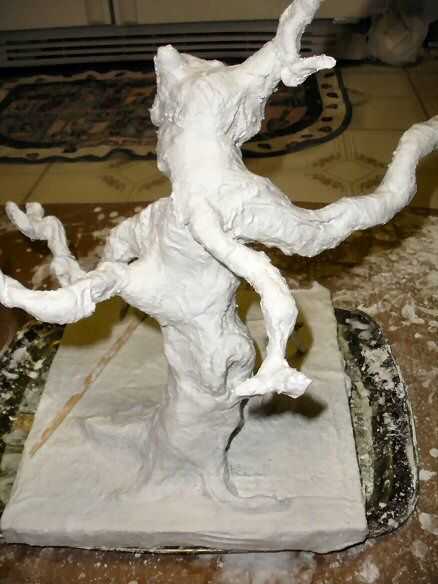 Tomar el segundo balde de agua y sumergir los paños de yeso uno a la vez, después de inmersión uno envuélvalo alrededor del árbol. Frotar suave por lo que no puede ver el patrón de la tela así. Seguir haciendo esto hasta que tenga su árbol entero cubierto y alisadas. Que tenga que tomarse un descanso y esperar a que el árbol estabilizar varias veces para no colapsar. Cubrir toda la base, incluso la parte inferior, como se trabaja con el árbol. I cortar un anillo de espuma de poliestireno en trozos para hacer las piernas para el soporte y había cubierto en el paño del yeso también. Mientras que cubren el árbol en la tela de yeso, también puede hacer diferentes características para poner en el árbol. He hecho un agujero en el árbol parece más viejo, y también he añadido las raíces alrededor de su base. También hice un montón por el árbol para una tumba. Si el árbol es agacharse demasiado uso un palo para apuntalar más hasta que se seque completamente.