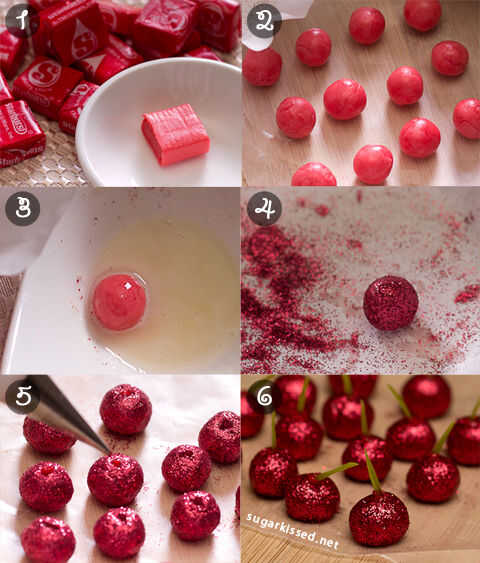 Preparar dos recipientes: uno con una pequeña mezcla de mitad agua y mitad merengue completamente mezclado y uno con una pequeña cantidad de rojo disco de polvo. Ruede cada bola de Starburst en el polvo de merengue y luego en el disco polvo hasta que estén cubierta. Establecer su cereza brillante a un lado completamente secos.