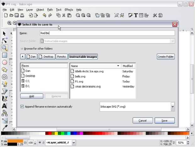 Elija "Guardar como..." del menú "Archivo". Aparece un cuadro de diálogo (ver imagen abajo). Cambiar el nombre a "Campanas rojas". De la lista desplegable elegir "Postscript encapsulado (*.eps).".