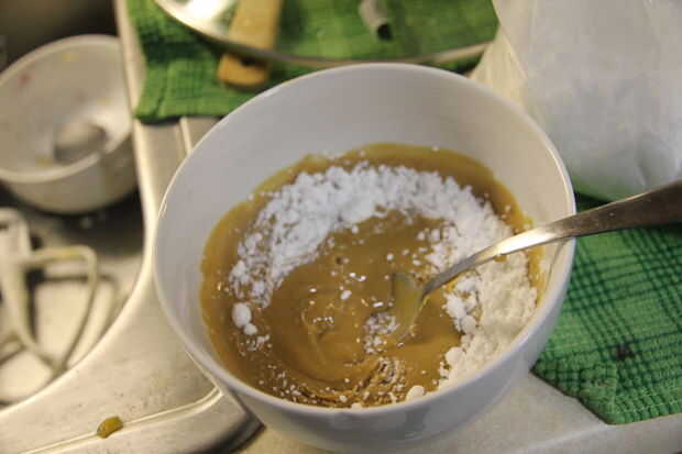 Derrita 3/4 de taza de mantequilla de maní hasta que esté líquido, mezcla unas cucharadas de azúcar glas, relajarse durante unos 15 minutos para que sea scoopable