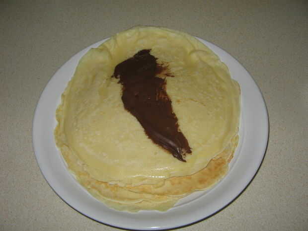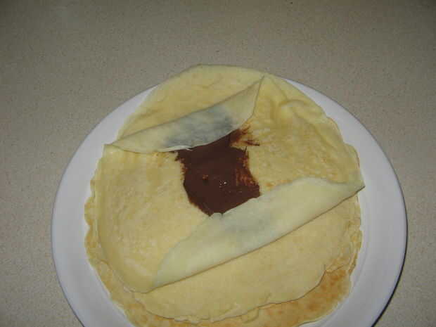 Ahora tienes una pila de crepes. Si usted los está llenando con yogur o nutella o algo similar puede poner una línea de su llenado por el centro. Doble los bordes y enrollar como un burrito.